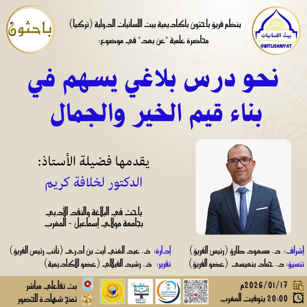 محاضرة تمت المشاركة بها عن بعد بالتنسيق مع بيت اللسانيات الدولية بتركيا يوم السبت 17 يناير 2026 ابداء من الساعة الثامنة مساء بتوقيت المغرب.